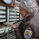 True looks out over trays of Chinook salmon eggs in the hatchery building. As they grow into juvenile salmon, they are moved into larger fish raceways from the hatchery building and fed a diet rich in protein, primarily made-up of fish meal with supplemental vitamins and minerals. Credit: Meagan Racey/USFWS