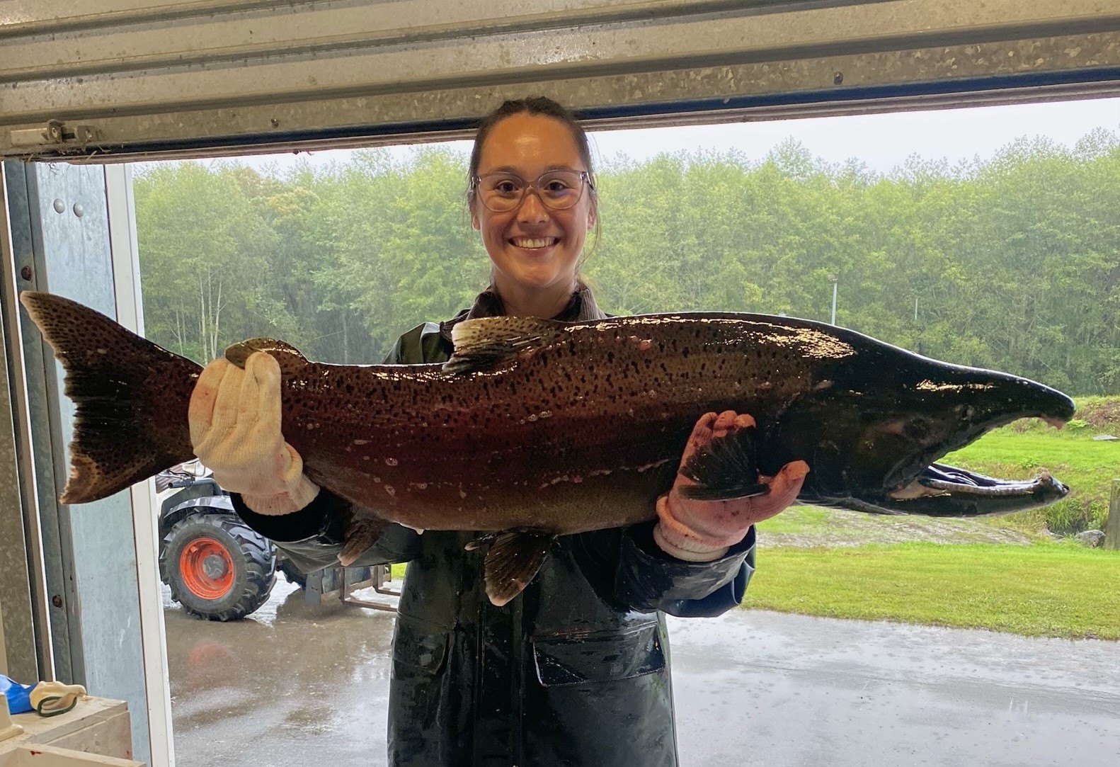 Bureau of Indian Affairs WaterCorps intern Maya Bass holds up the largest Chinook salmon of the day during spawning and bio sampling at Makah National Fish Hatchery.