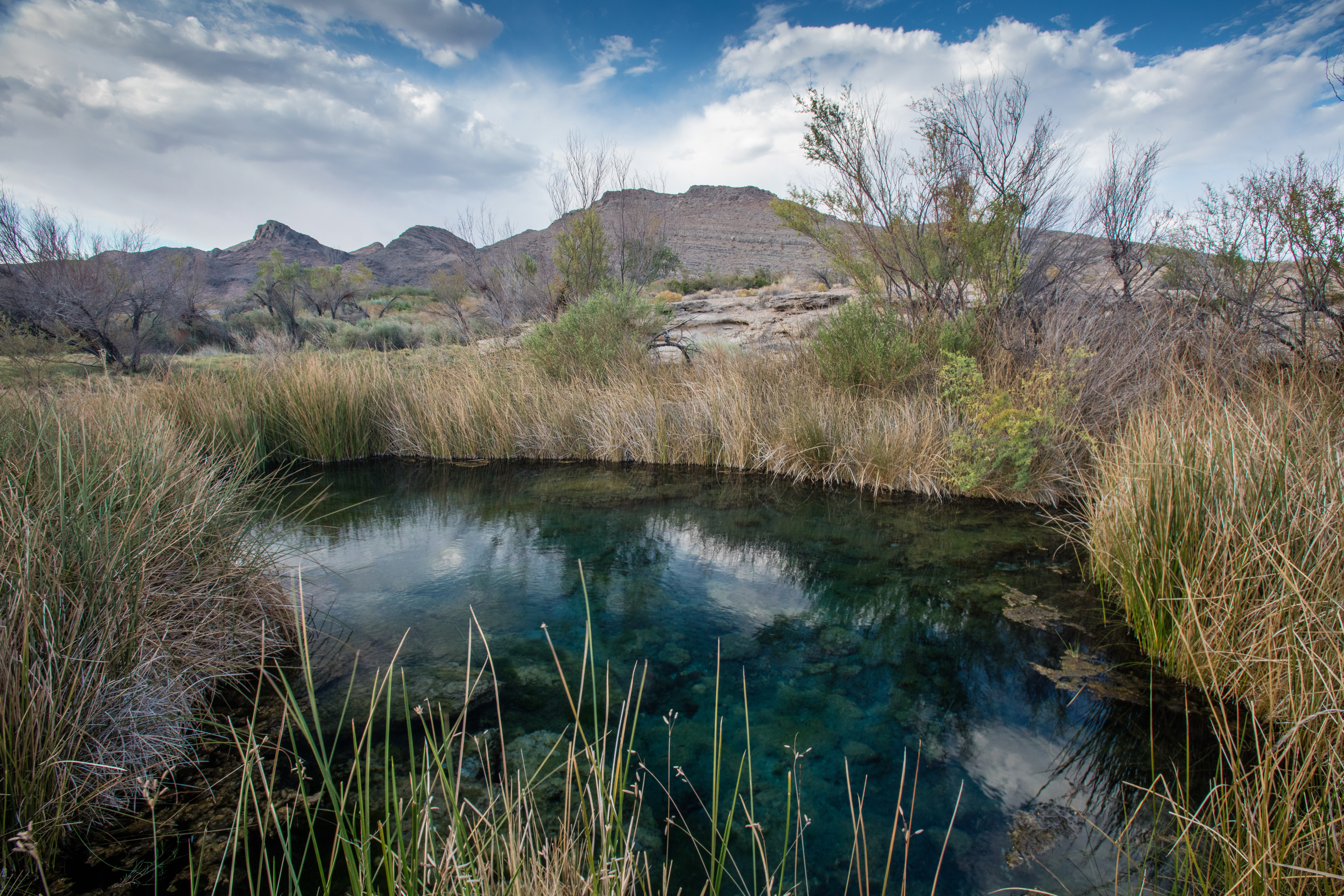 Previously known as "Point of Rocks Springs," Kings Pool was named after Charles King who lived in a stone house near the spring. Historical records credit him with being the first to bring a herd of cattle to Ash Meadows. In the 1960s, the spring was channelized to provide water for agricultural purposes. In 1997, the U. S. Fish and Wildlife Service began a number of restoration projects at Kings Pool and the outflow channel, restoring the pool to its original status.