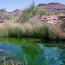 Previously known as "Point of Rocks Springs," Kings Pool was named after Charles King who lived in a stone house near the spring. Historical records credit him with being the first to bring a herd of cattle to Ash Meadows. In the 1960's, the spring was channelized to provide water for agricultural purposes. In 1997, the U. S. Fish and Wildlife Service began a number of restoration projects at Kings Pool and the outflow channel, restoring the pool to its original status. Image was taken from USFWS Pacific Southwest Region Flickr page.