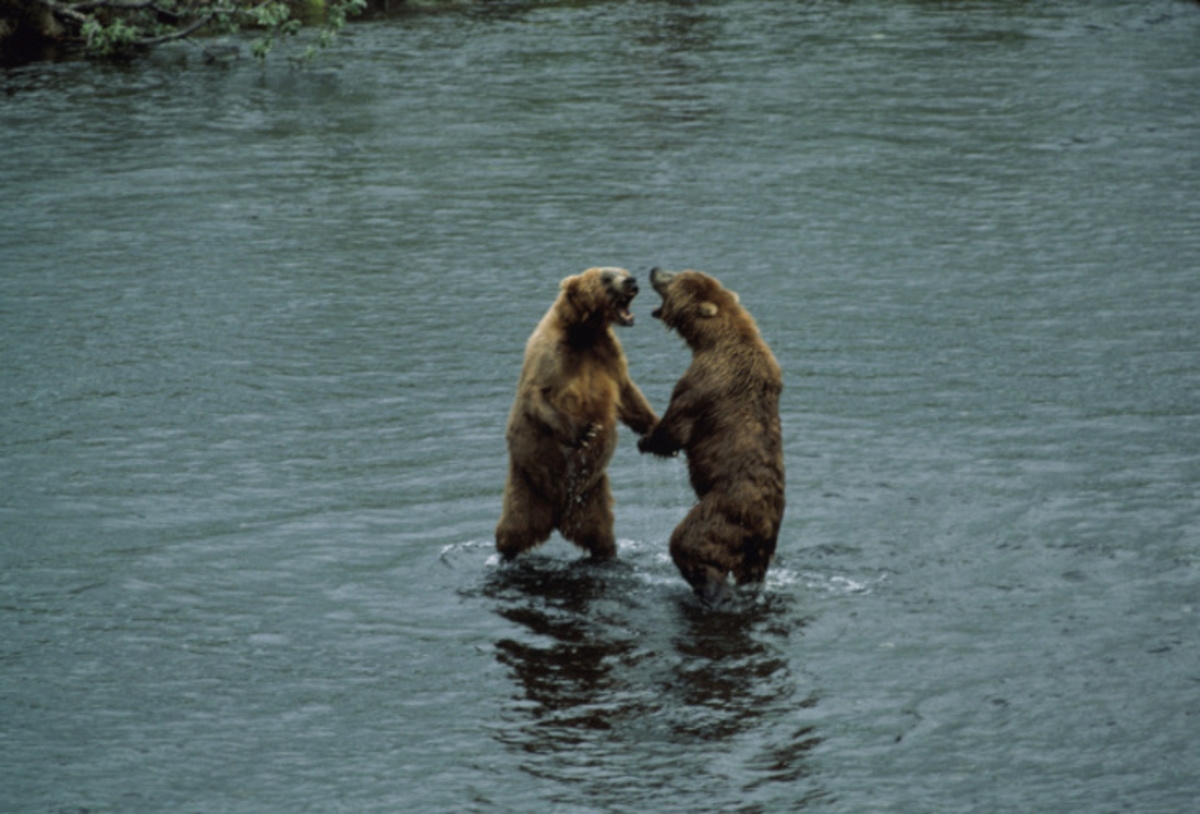 Two brown bears standing in Dog Salmon Creek sparing with each other.