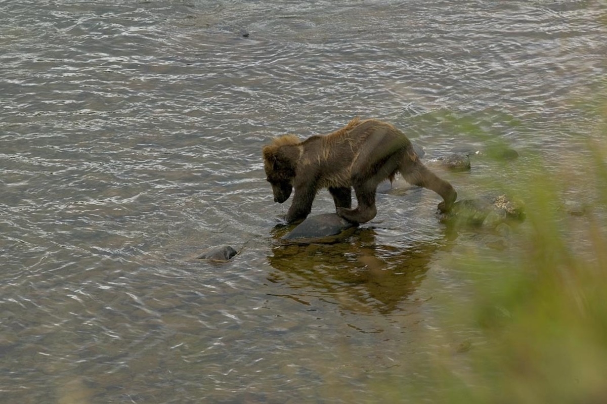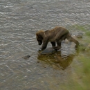 Brown bear cub walking into the water in the Kodiak National Wildlife Refuge, Alaska.