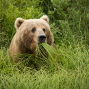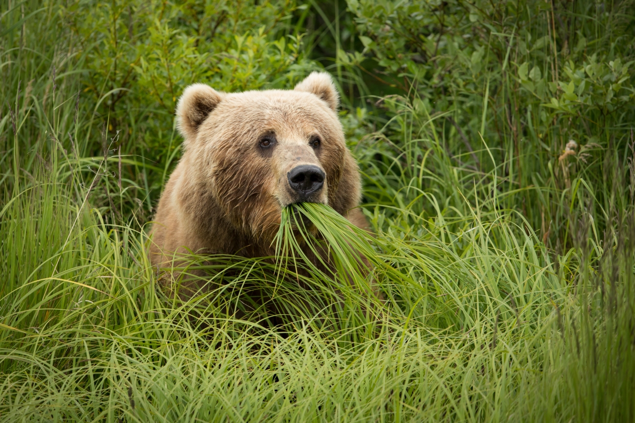 A Kodiak brown bear eats green sedges at Kodiak National Wildlife Refuge in Alaska.