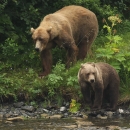 Kodiak brown bear sow and cub look along the river ban for an easy salmon catch. Kodiak brown bears are a distinct subspecies from mainland brown bears; they have been isolated on the archipelago since the last ice age, about 12,000 years ago. A rich variety of vegetation, salmon, and berries provide ideal habitat for bears, and their population flourishes - estimated at about 3,000 bears within the boundaries of the Kodiak Refuge.