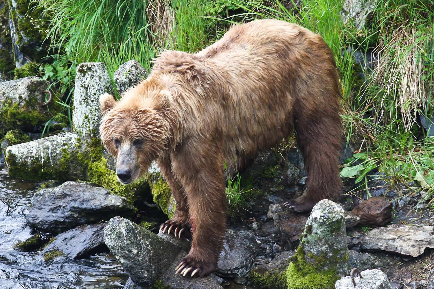 Kodiak brown bear watching for fish on the Dog Salmon River. Kodiak brown bears are a distinct subspecies from mainland brown bears; they have been isolated on the archipelago since the last ice age, about 12,000 years ago. A rich variety of vegetation, salmon, and berries provide ideal habitat for bears, and their population flourishes - estimated at about 3,000 bears within the boundaries of the Kodiak Refuge.