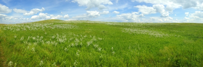 This panoramic view shows the lush green-up in summer 2014 after a prescribed fire that spring. Silverleaf scurfpea is the sage/silver colored plant dotting the hillsides.