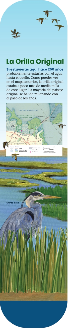 Original Shoreline/La Orilla Original Kiosk Panel at Don Edwards San Francisco Bay NWR. Native species of birds and marsh plants around the bay edge. Birds include a heron and ducks, in and flying over the wetland with a map showing the historical shoreline of the Ravenswood area.