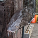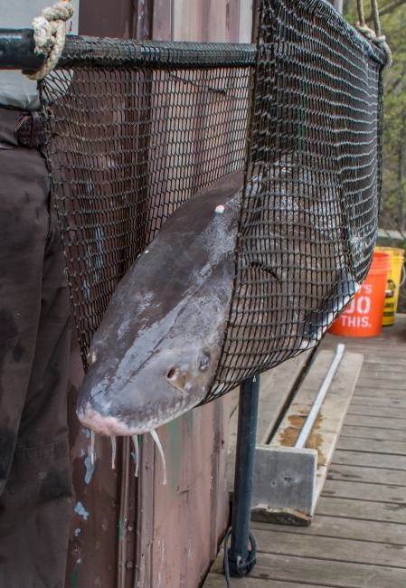 Lake sturgeon in net being weighed. Endangered and/or threatened species.