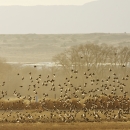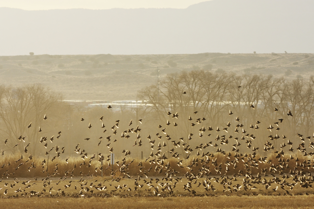 Large flock of Blackbird species take flight from field at Valle de Oro NWR.