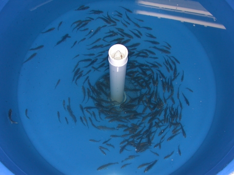 The 250 gallon tank with double stand pipe is capable of holding a large number of infested fish. Photo: Chris Barnhart, Missouri State University.