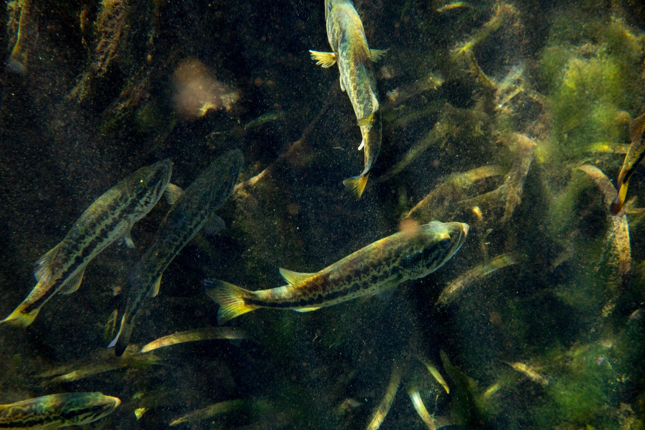 Largemouth bass schooled and waiting for food in a Florida spring at Ocala National Forest.