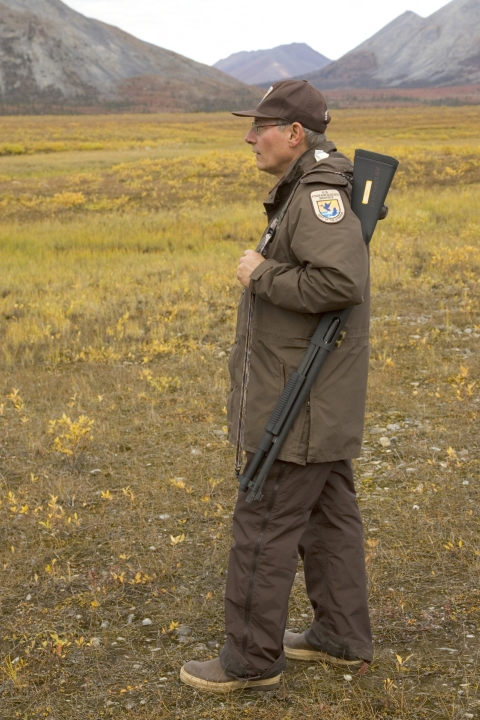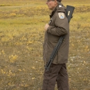 This picture shows a Law enforcement officer carrying a weapon at the Arctic National Wildlife Refuge.