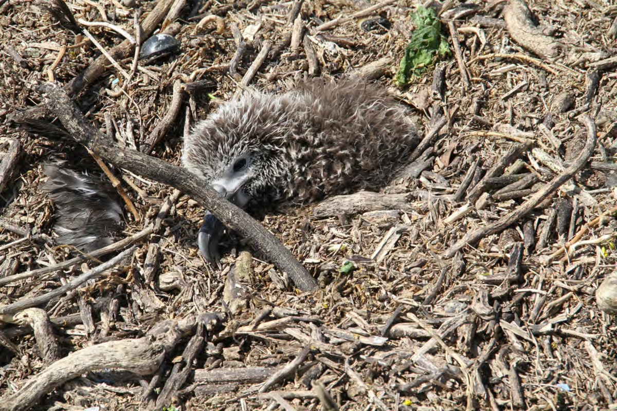 Laysan albatross chick stuck in debris after a tsunami generated by a powerful earthquake off the coast of Japan struck the refuge at 11:36 PM on Thursday, March 10th and continued for the next few hours. On March 15, FWS released an official announcement stating that surveys of the three islands reveal that more than 110,000 albatross chicks – about 22% of this year’s albatross production – were lost as a result of the tsunami and two severe winter storms that hit in January and February. At least 2,000 adults also died. Image taken from USFWS Pacific Region Flickr page.