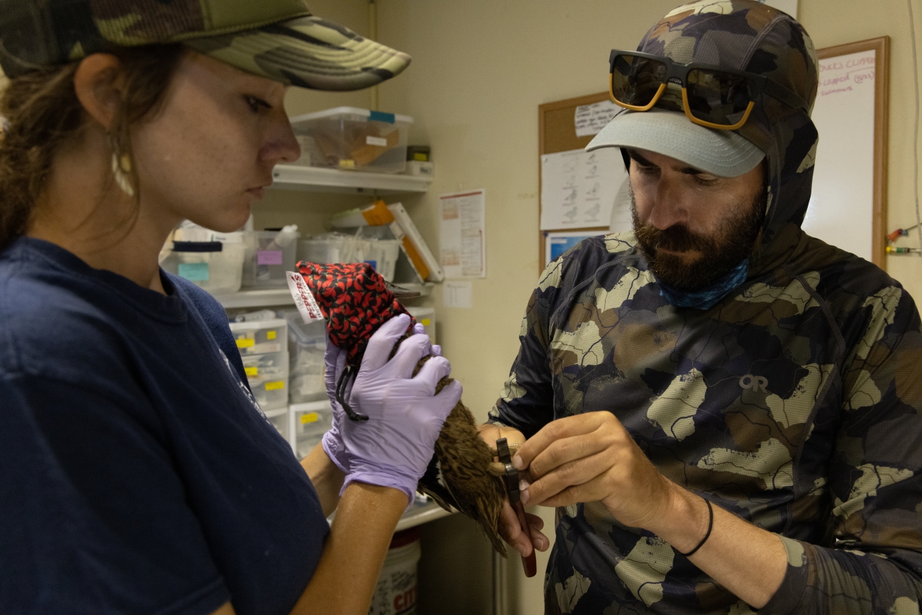 An endangered Laysan duck with a hood over its head to keep it calm while receiving bird bands in the Duck Lab on Midway Atoll National Wildlife Refuge during the Seabird Protection Project.