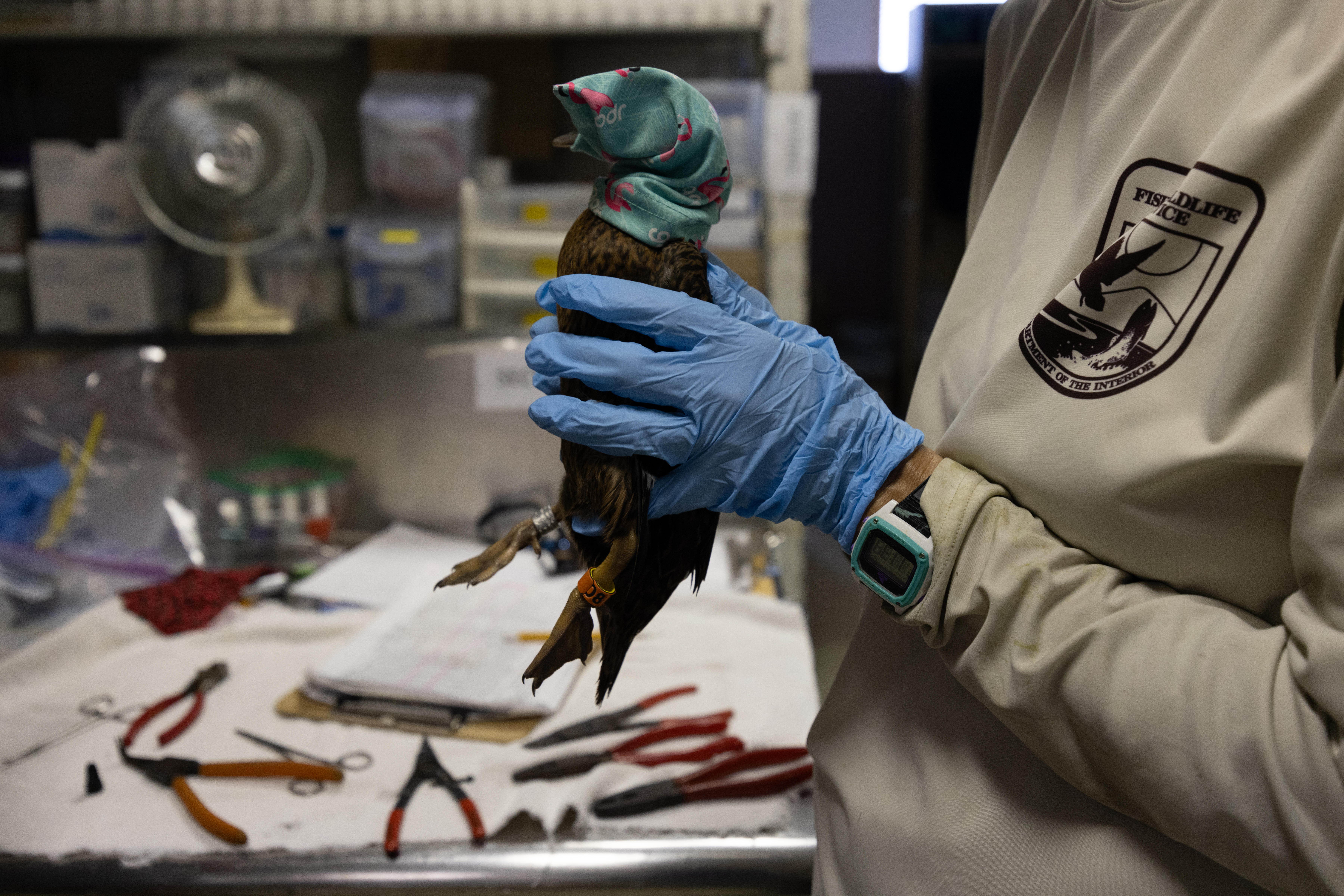 An endangered Laysan duck with a hood over its head to keep it calm while receiving bird bands in the Duck Lab on Midway Atoll National Wildlife Refuge during the Seabird Protection Project.