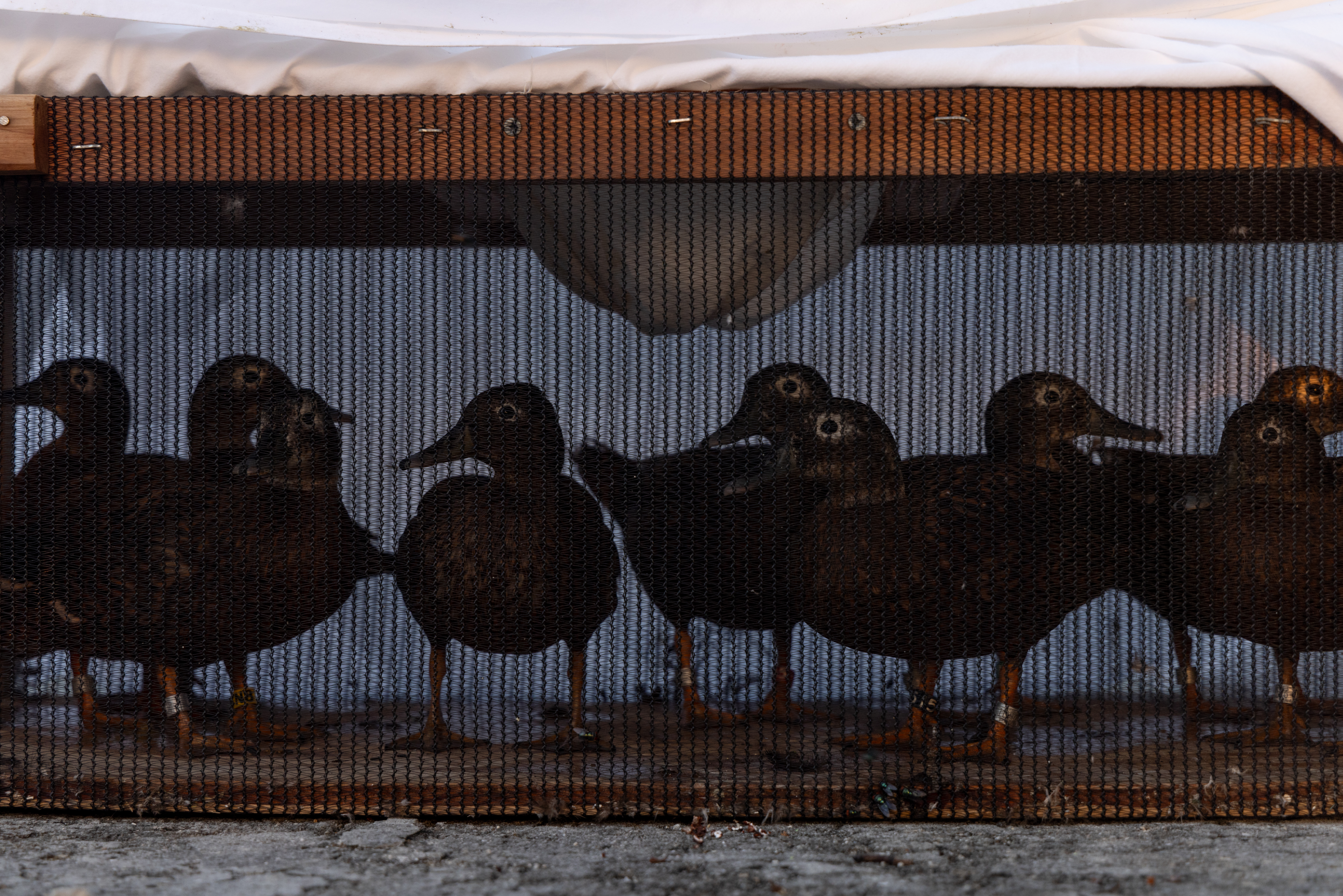 Endangered Laysan ducks after getting captured by the Duck Team at Catchment on Midway Atoll National Wildlife Refuge during the Seabird Protection Project.