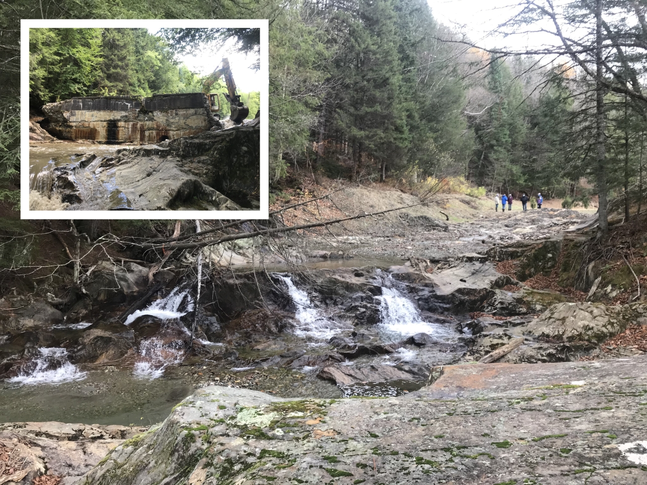 Camp Wihakowi dam site with no dam in place, stream flowing unperturbed in stream channel with an inset showing site before removal.