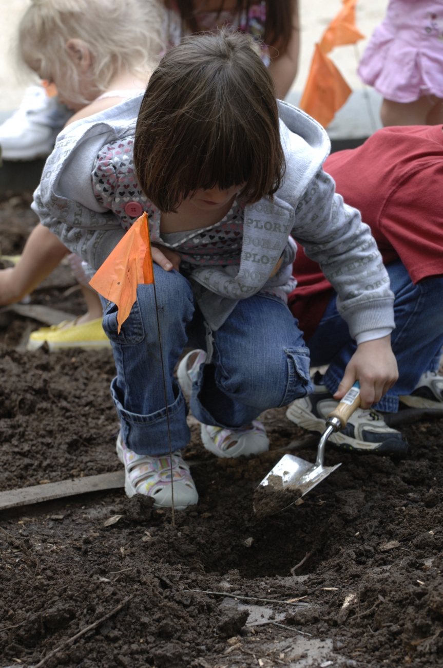 A young girl uses a trowel to dig a hole for plants in the pollinator garden at NCTC.