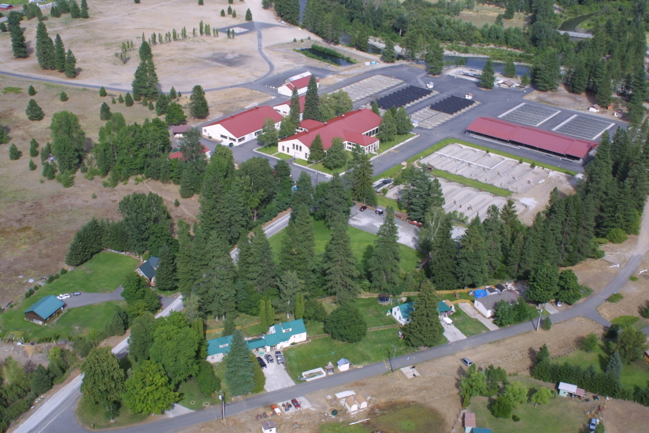 An aerial view of Leavenworth National Fish Hatchery in Leavenworth, Washington. Headquarters for the Leavenworth Fisheries Complex, the hatchery raises and releases approximately 1.2 million spring Chinook salmon each year.