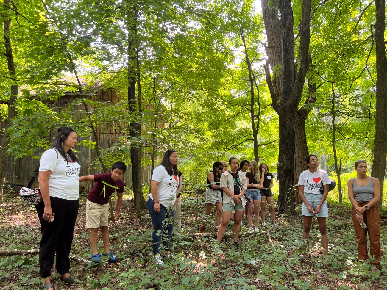 Lenape-descendant youth and coordinators stand listening to an ecology session in the Delaware Water Gap National Recreation Area during the Lenapehoking Youth Conference.