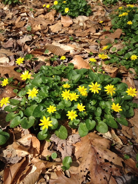 Lesser celandine is a perennial herbaceous plant that forms low-growing mats. Location: Delaware County, Pennsylvania.