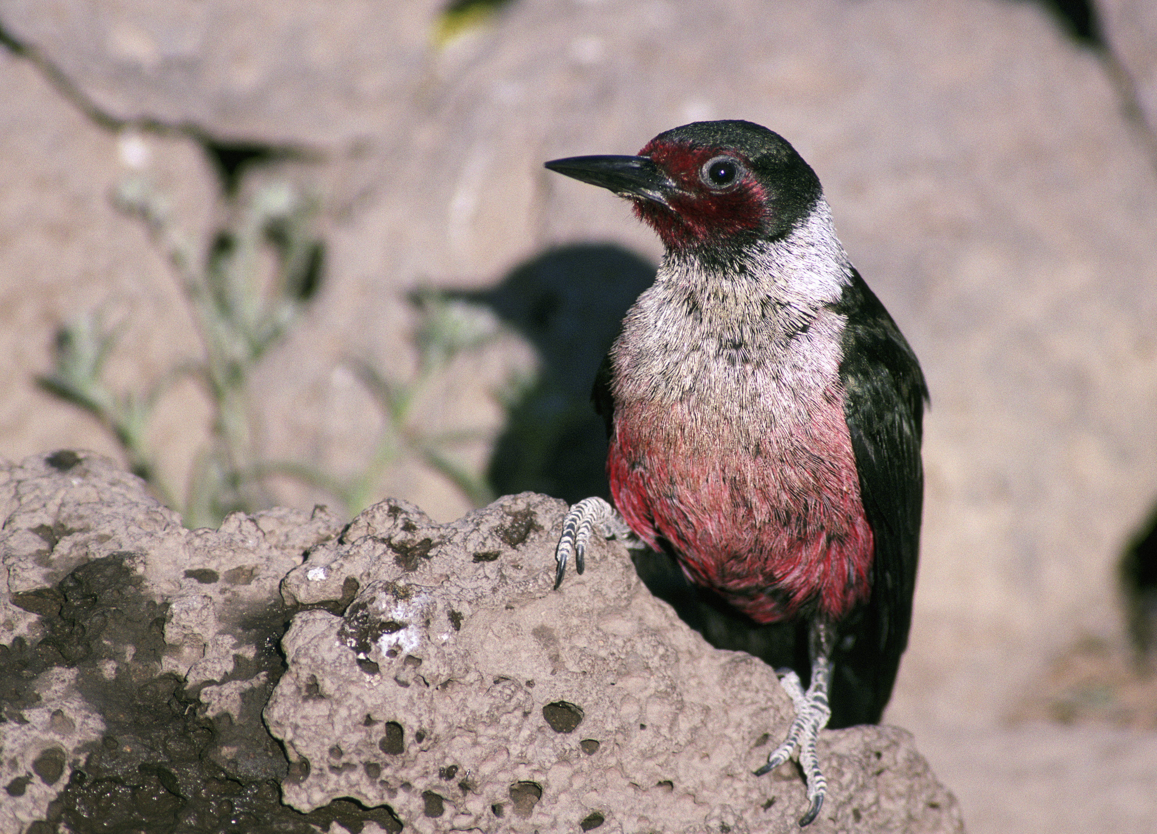 Lewis' woodpecker is found primarily in the west, and rarely on the coast. It eats insects, mostly caught in the air, fruits and nuts. Lewis' woodpecker also shells and stores acorns in the bark of trees.