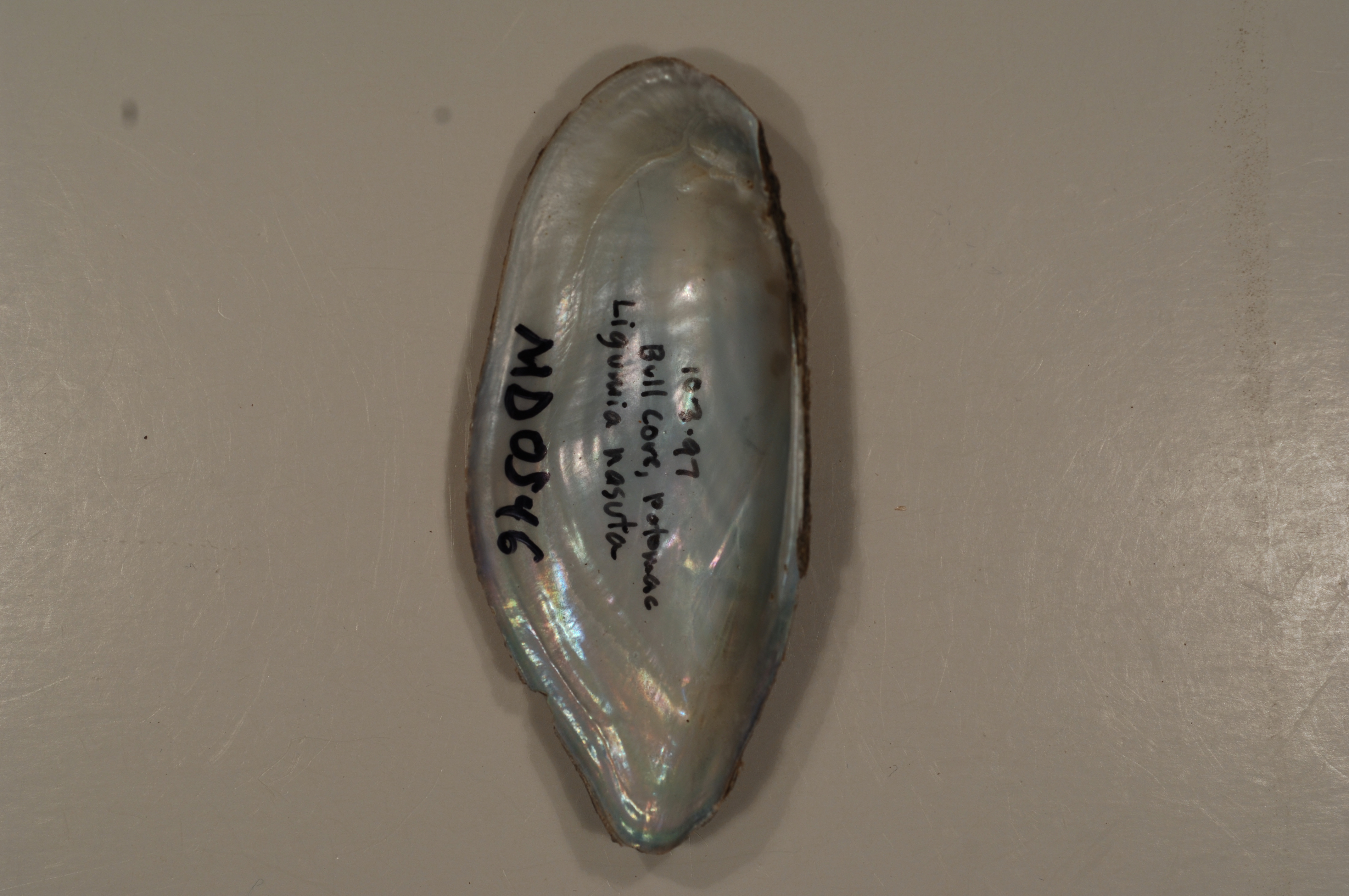 NCTC Freshwater Mussels Teaching Collection: Order: Unionoida Family: Unionidae Genus (ITIS): Ligumia Species: nasuta (inside) Williams et al.: Use to be: Location Name: Bull Cove, Potomac River Location State: MD