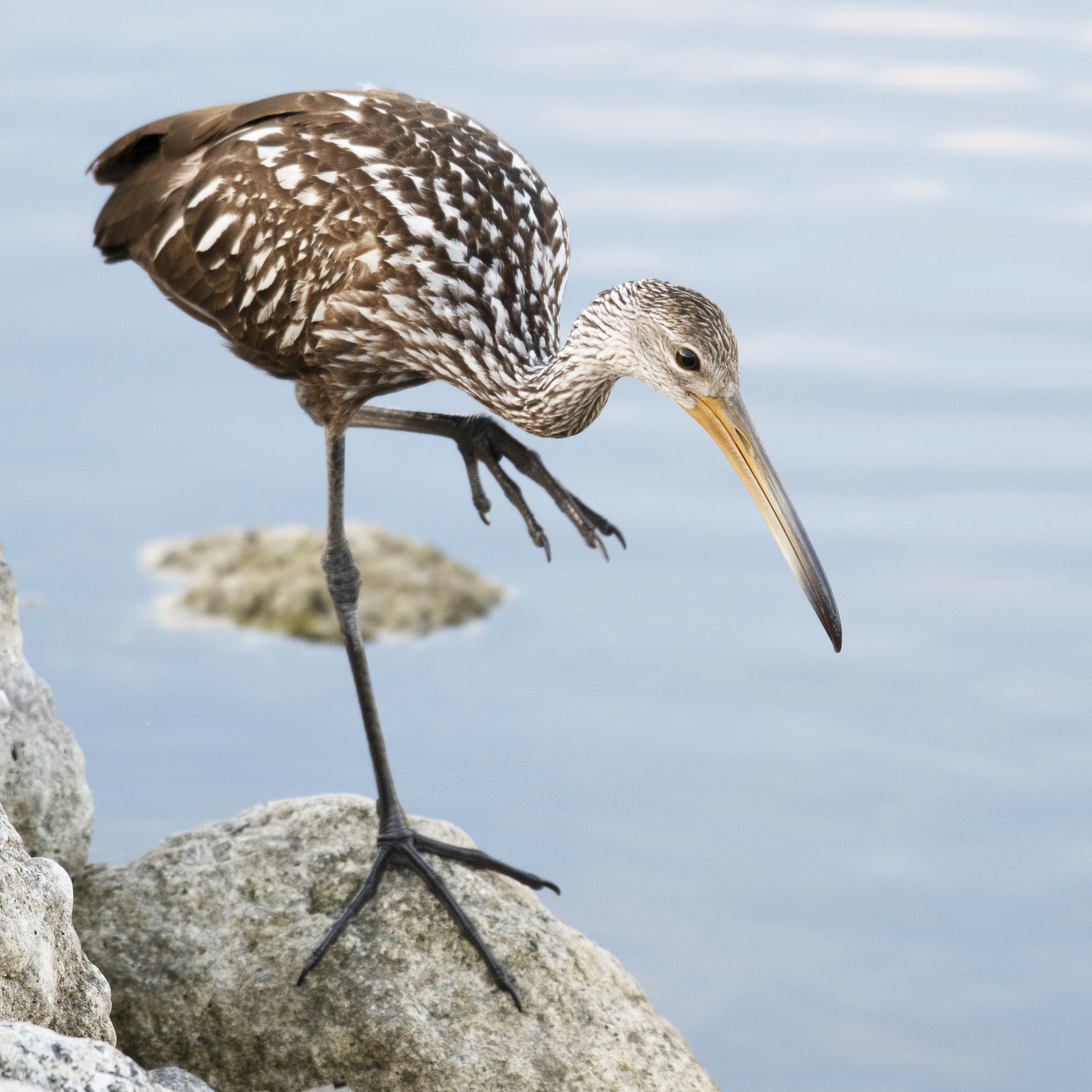 Limpkins are tropical wetland birds whose range reaches into Florida. They specialize in eating apple snails, which they hunt both day and night, and they often leave telltale piles of snail shells at the edges of freshwater wetlands where hunting is good.