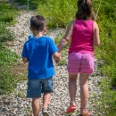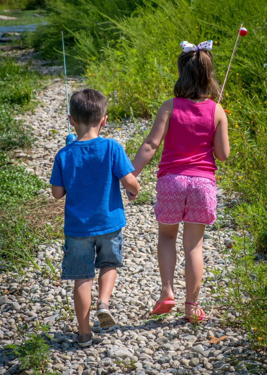 Little boy and girl going fishing, walking along creek