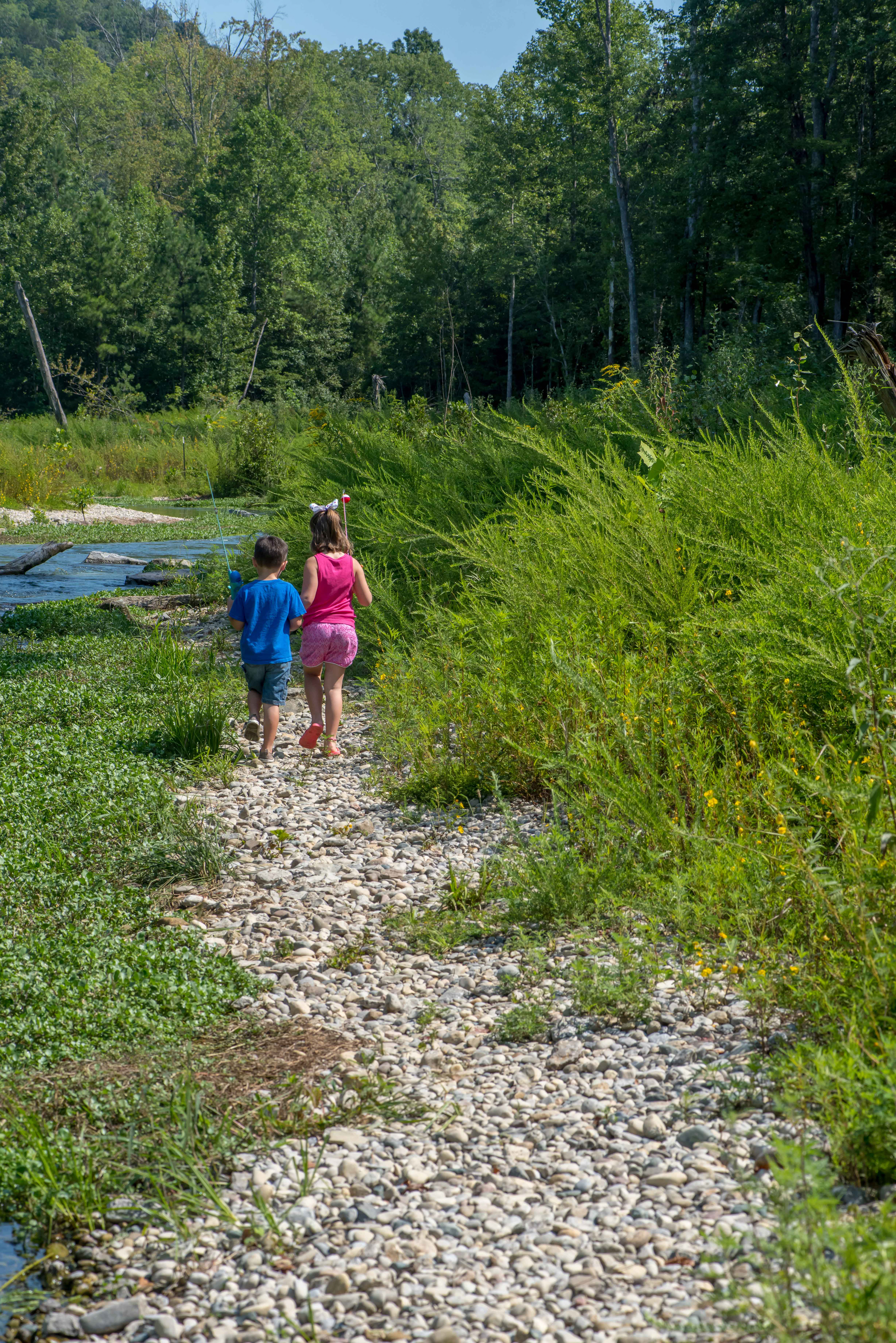 Little boy and girl going fishing, walking along creek