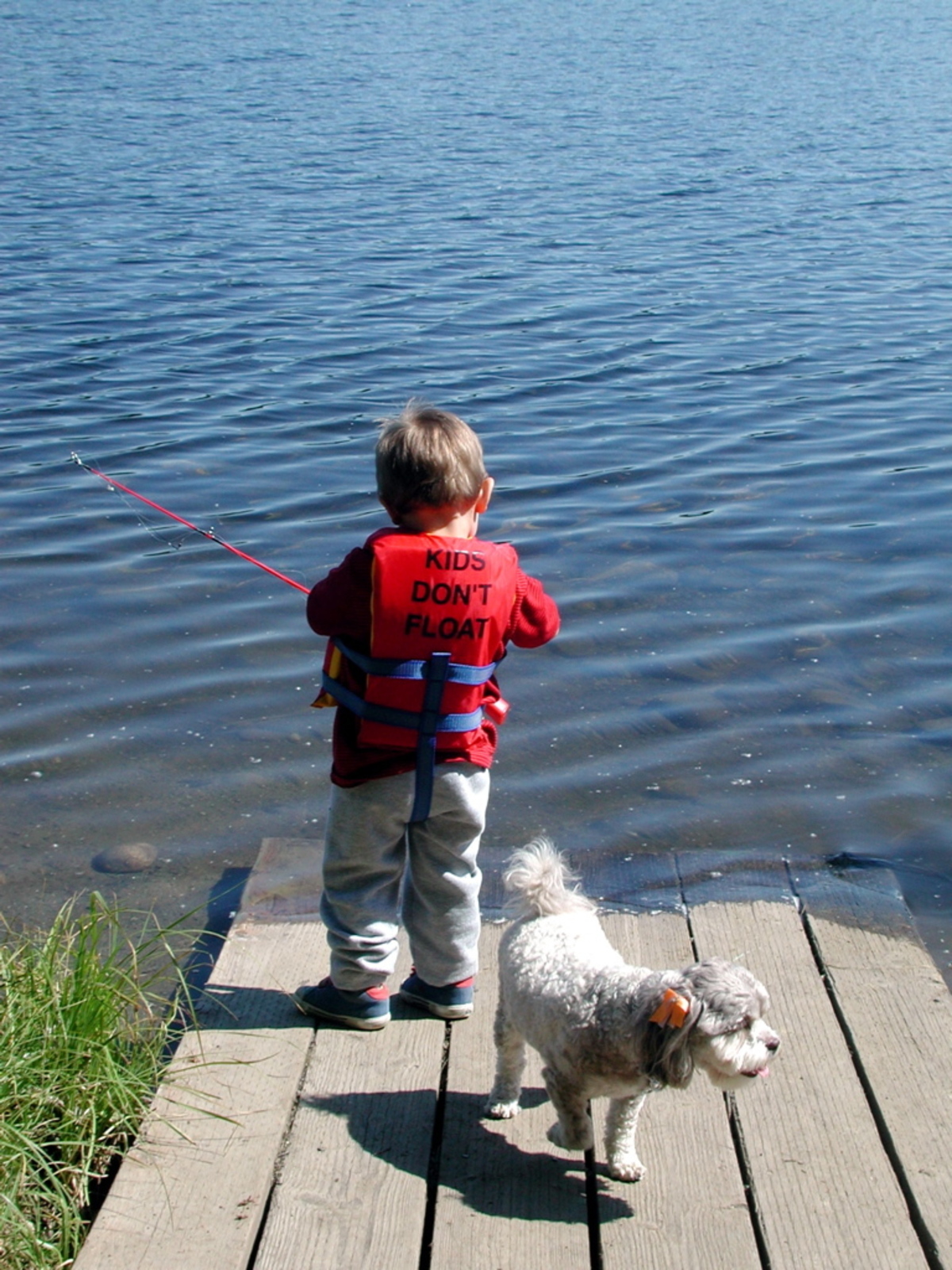Boy with life preserver fishes off pier with dog near by.