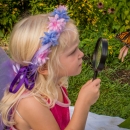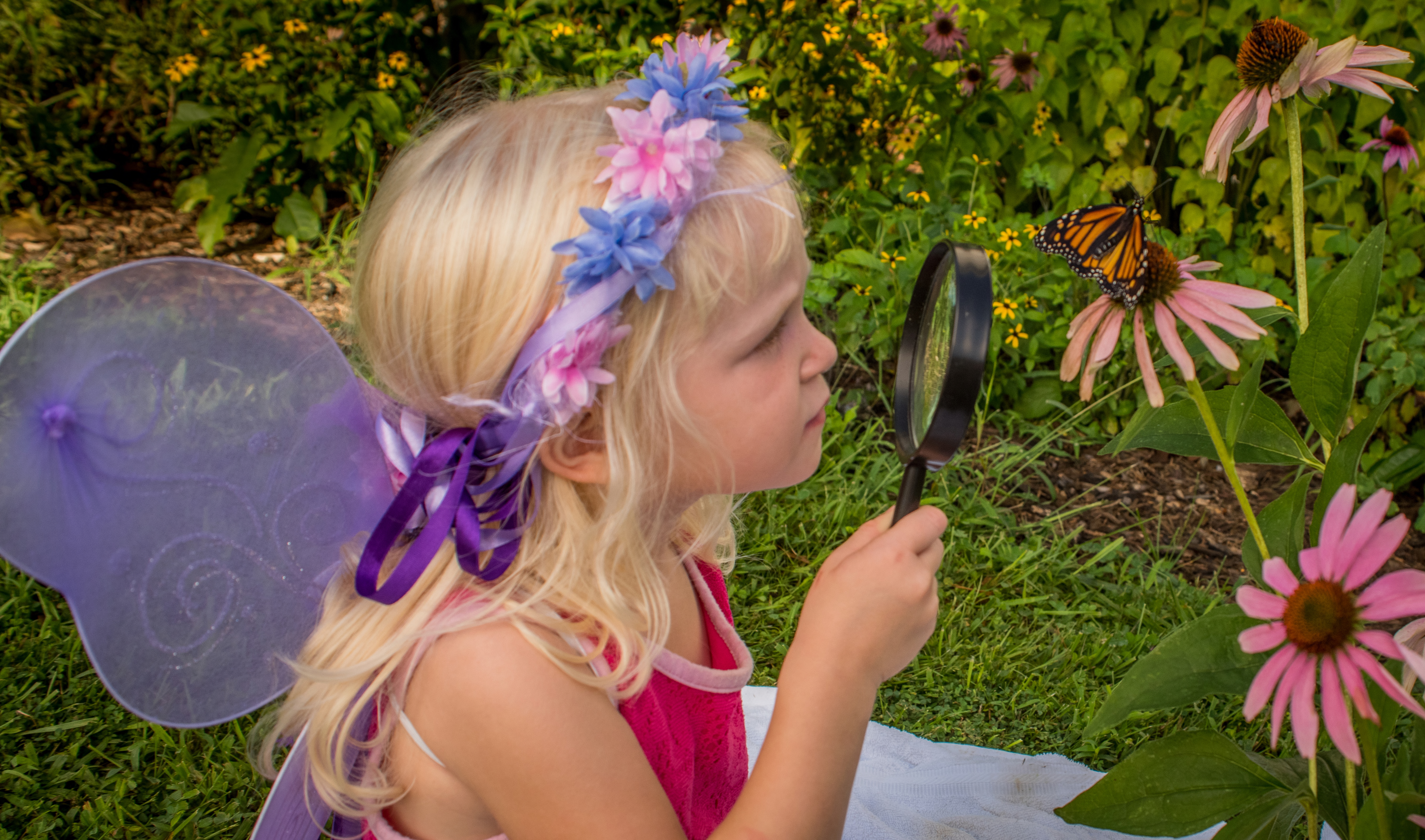 Little girl looks at monarch through eye glass
