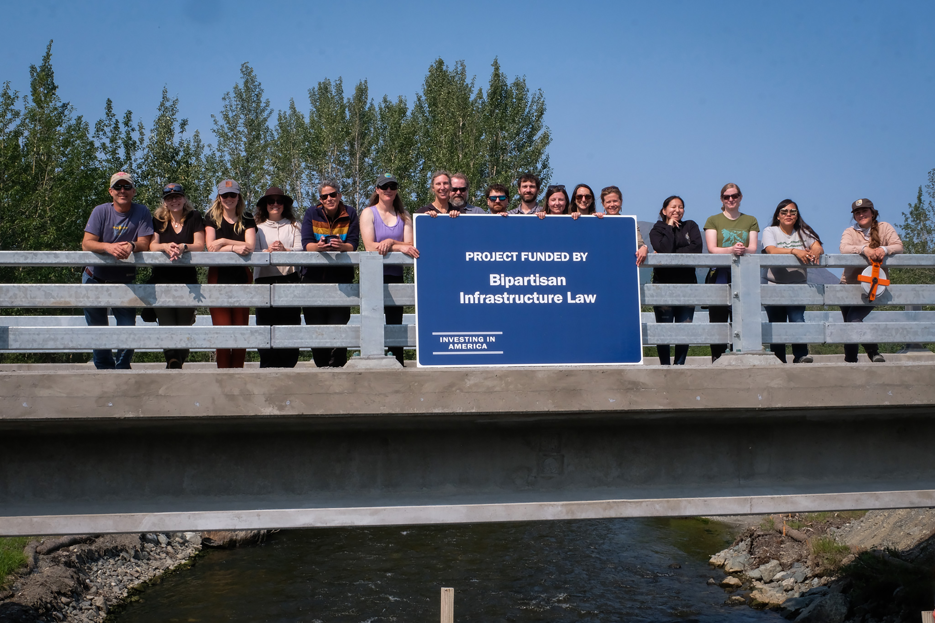 Partners stand on a new bridge over the Little Tonsina River in Alaska.