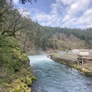 A photograph of the weir and hatchery intake and salmon viewing platform at Little White Salmon National Fish Hatchery. Located in Cook, Washington on the Little White Salmon River and adjacent to Drano Lake, one of southern Washington's premiere sport fishing locations, the hatchery has been in continuous operation since 1896. Little White Salmon National Fish Hatchery raises approximately 5.5. million spring Chinook salmon and fall up-river bright fall Chinook salmon annually, and collects nearly 11 million salmon eggs used by other hatcheries in the region for their salmon propagation programs. The hatchery mitigates fishery losses due to the operation of hydroelectric dams on the Columbia River, and is part of a network of six National Fish Hatcheries located both in Washington within the Columbia River Gorge, and Oregon.
