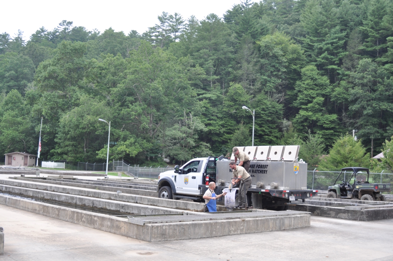 Loading distribution truck with trout at Chattahoochee Forest National Fish Hatchery