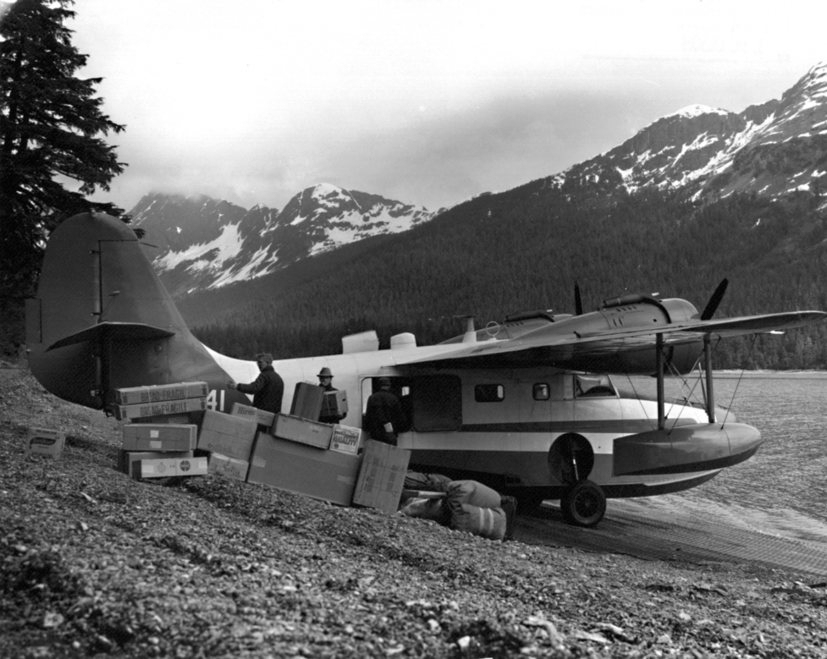 Olson Bay and Grumman Goose. Off-loading U.S. Fish and Wildlife Service Grumman N741 food supplies by Theron Smith, Ted Merrill, and Fred Thorsteinson. ARLIS; Alaska; FWS-5129