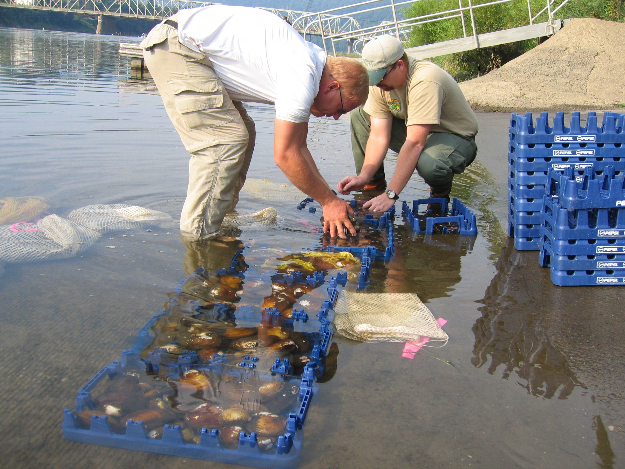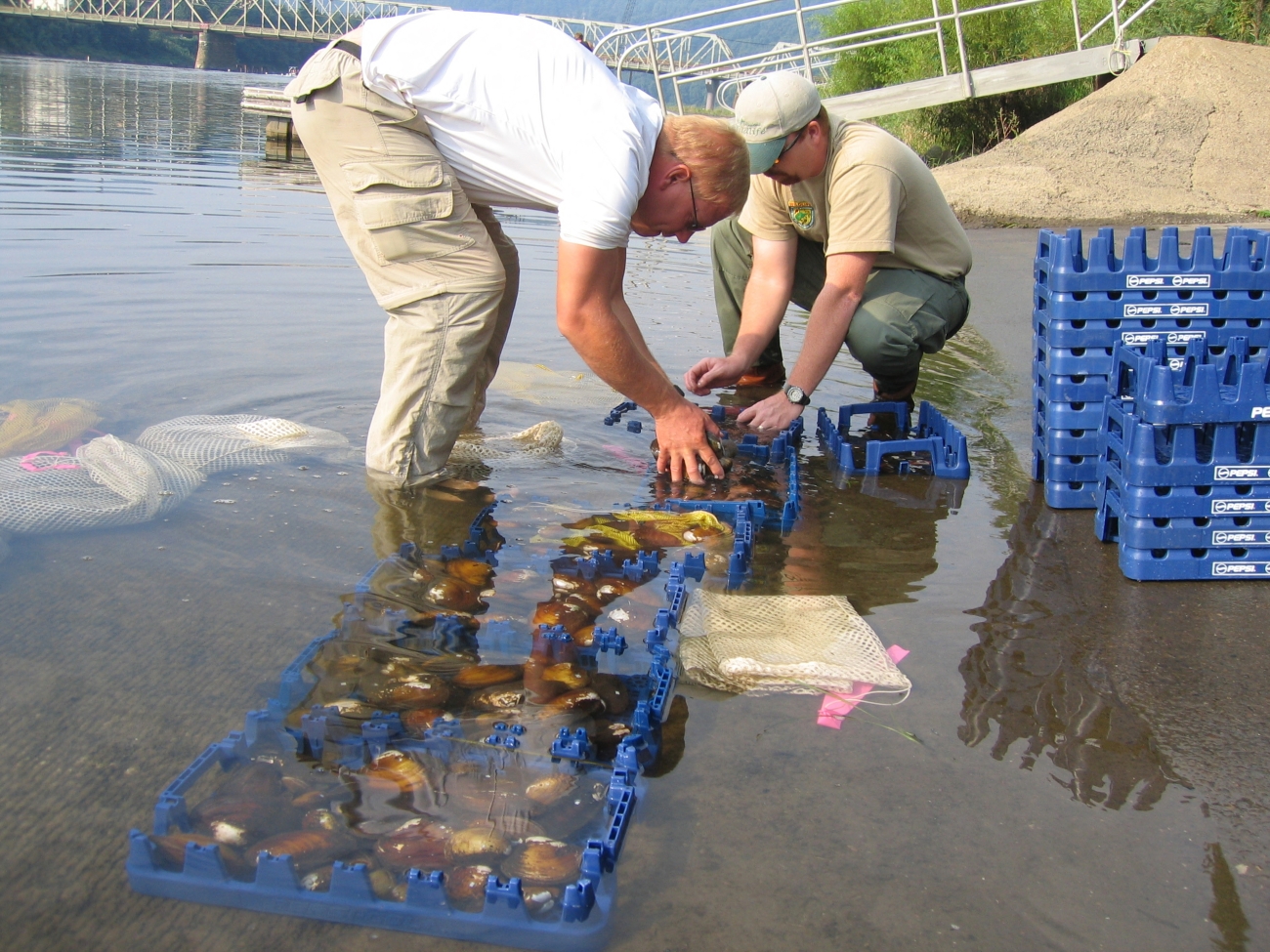 West Virginia Division of Natural Resources staff loading mussels into stackable plastic dish racks for transport in a fish hauling truck. The racks help prevent mussels on the bottom of the hauling tank from being crushed. Photo: Janet Clayton, West Virginia Division of Natural Resources