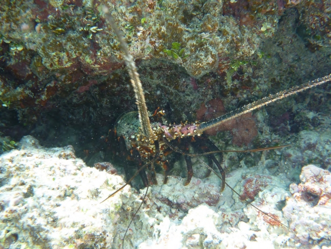 A lobster peeks out from its shelter in a reef near Tern Island. The extensive coral reefs found in the Papahānaumokuākea Marine National Monument - truly the rainforests of the sea - are home to over 7,000 marine species, one quarter of which are found only in the Hawaiian Archipelago. Many of the islands and shallow water environments are important habitats for rare species such as the threatened green sea turtle and the endangered Hawaiian monk seal.