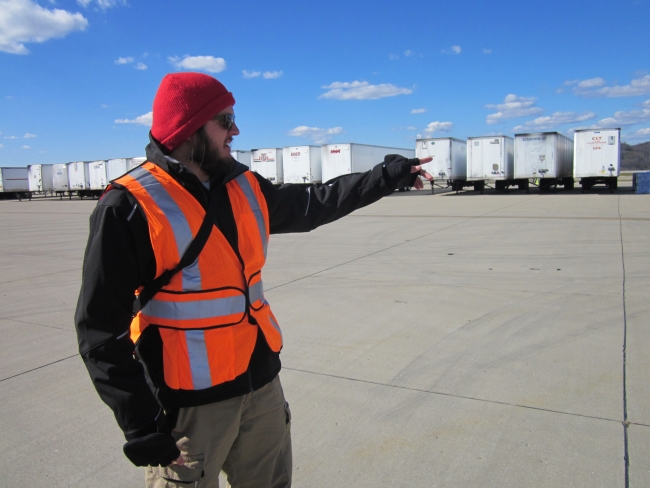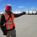 Josh O'Connor, Division Supervisor of the Southern Area Red Type 1 Incident Management Team points to trailers of storm relief supplies at a Logistical Staging Area at Yeager Airport. O'Connor was on a FEMA assignment with the team. Food, water, generators and other supplies were collected and distributed by the National Guard for storm victims. About 700 pallets of water and 300 pallets of food were distributed.O'Connor is a fire management specialist at the Atlanta, Georgia Regional Office of the U.S. Fish and Wildlife