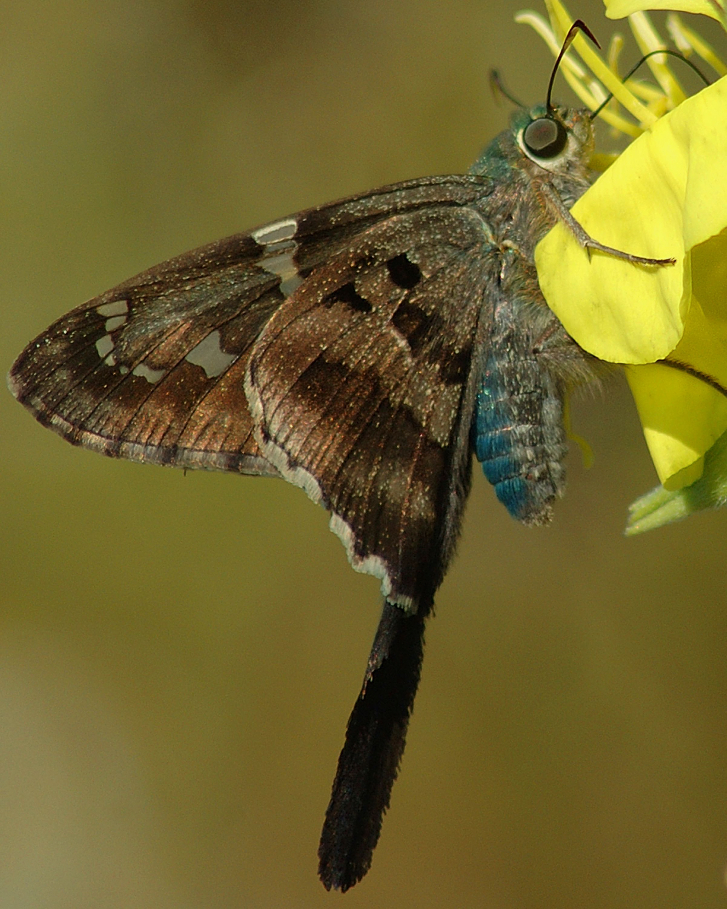 Long-tailed Skipper Butterfly on a yellow flower.