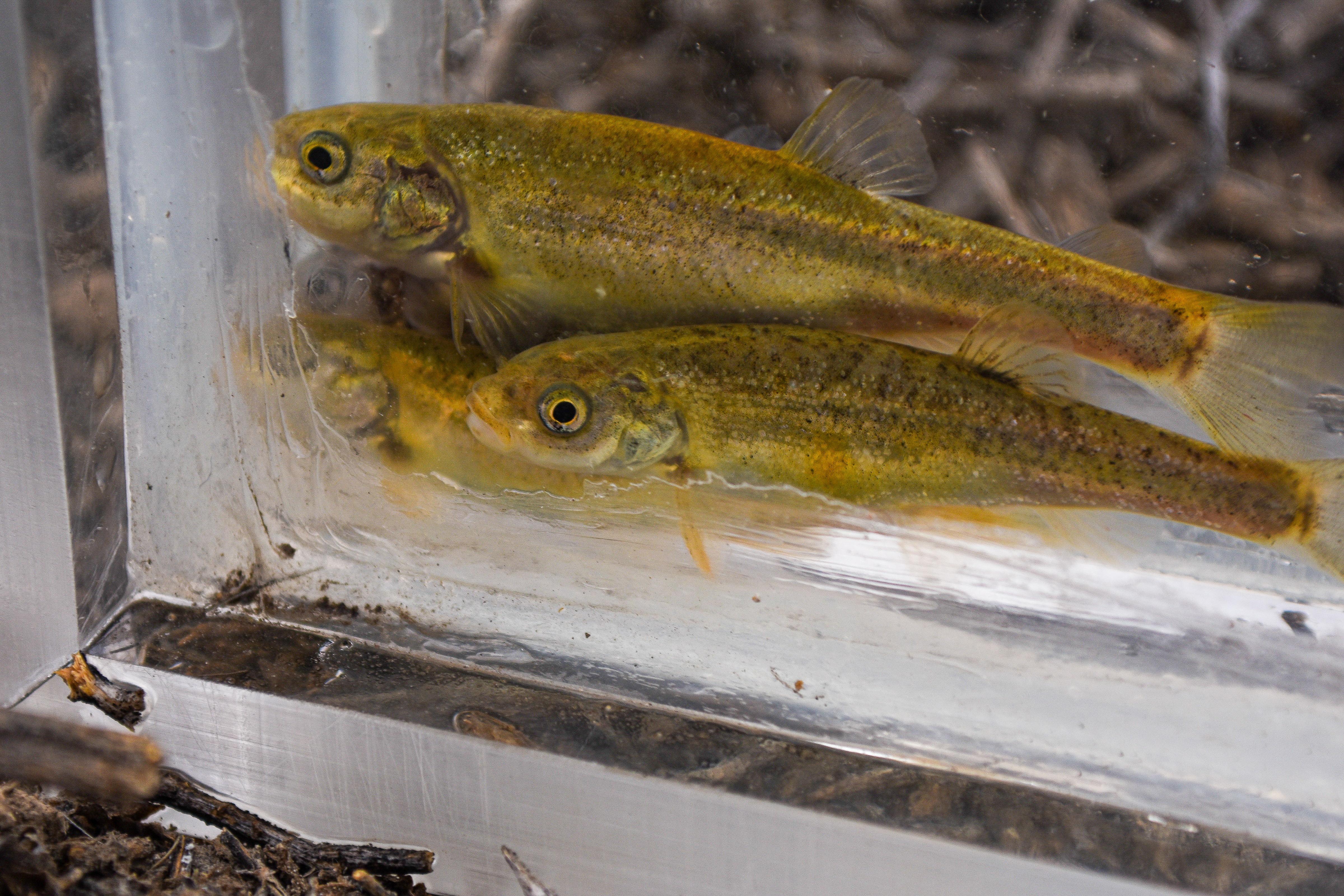 Long Valley speckled dace is currently a petitioned species for listing. This small fish is currently found in only one location within the Long Valley Caldera near Mammoth Lakes, CA. While previously distributed throughout the caldera, all but one population of the species has been extirpated from its historic habitat. Long Valley Caldera is one of the largest calderas in the world and was formed around 760,000 years ago. Threats to the species include nonnative predatory fish and loss of habitat. Credit: Robyn Gerstenslager/USFWS