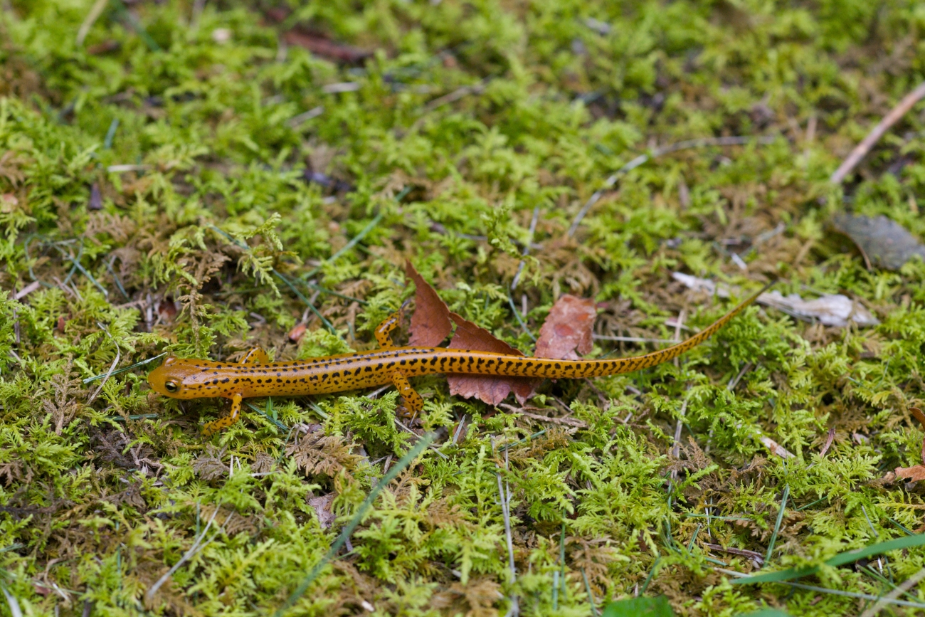 View of a Longtail salamander standing on moss; image taken in Monongalia County, WV.