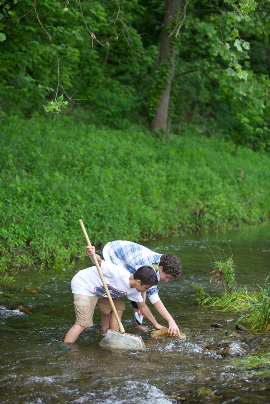 School children test water quality chemistry/survey macroinvertebrates at Seneca Rocks, WV.