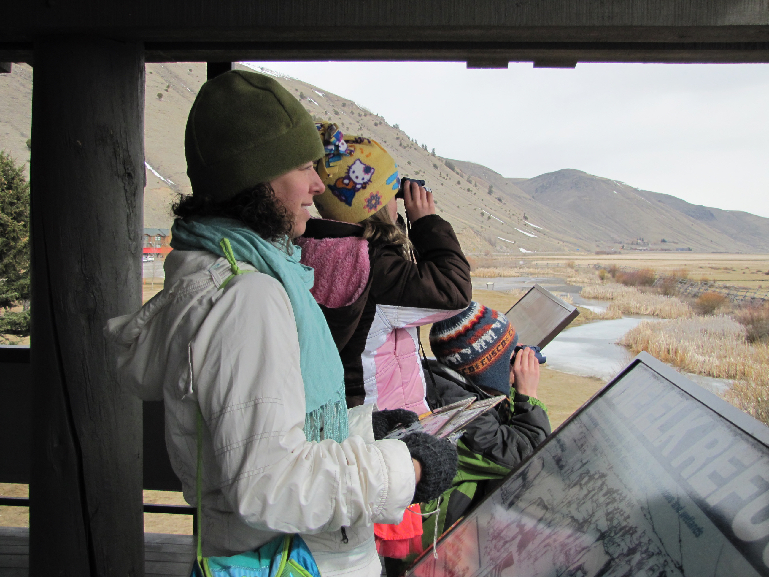 On a chilly March morning, a family on spring break looks for wildlife on the National Elk Refuge from the viewing deck at the Jackson Hole & Greater Yellowstone Visitor Center.