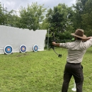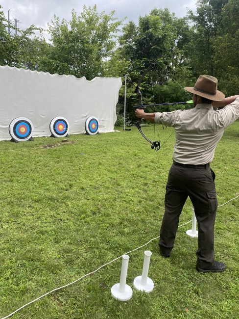 Park Ranger Wilson Acuna demonstrating how to shoot a bow.
