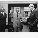 Lynn A. Greenwalt (center) being sworn in as the Director of the U.S. Fish and Wildlife Service by Secretary of the Interior Rogers C.B. Morton (right), in the Director's office at the Department of the Interior Building, Washington, D.C. Mr. Greenwalt's wife Judy stands beside him. Assistant Secretary of the Interior Nathaniel "Nat" Reed appears on the left. October 30, 1974.