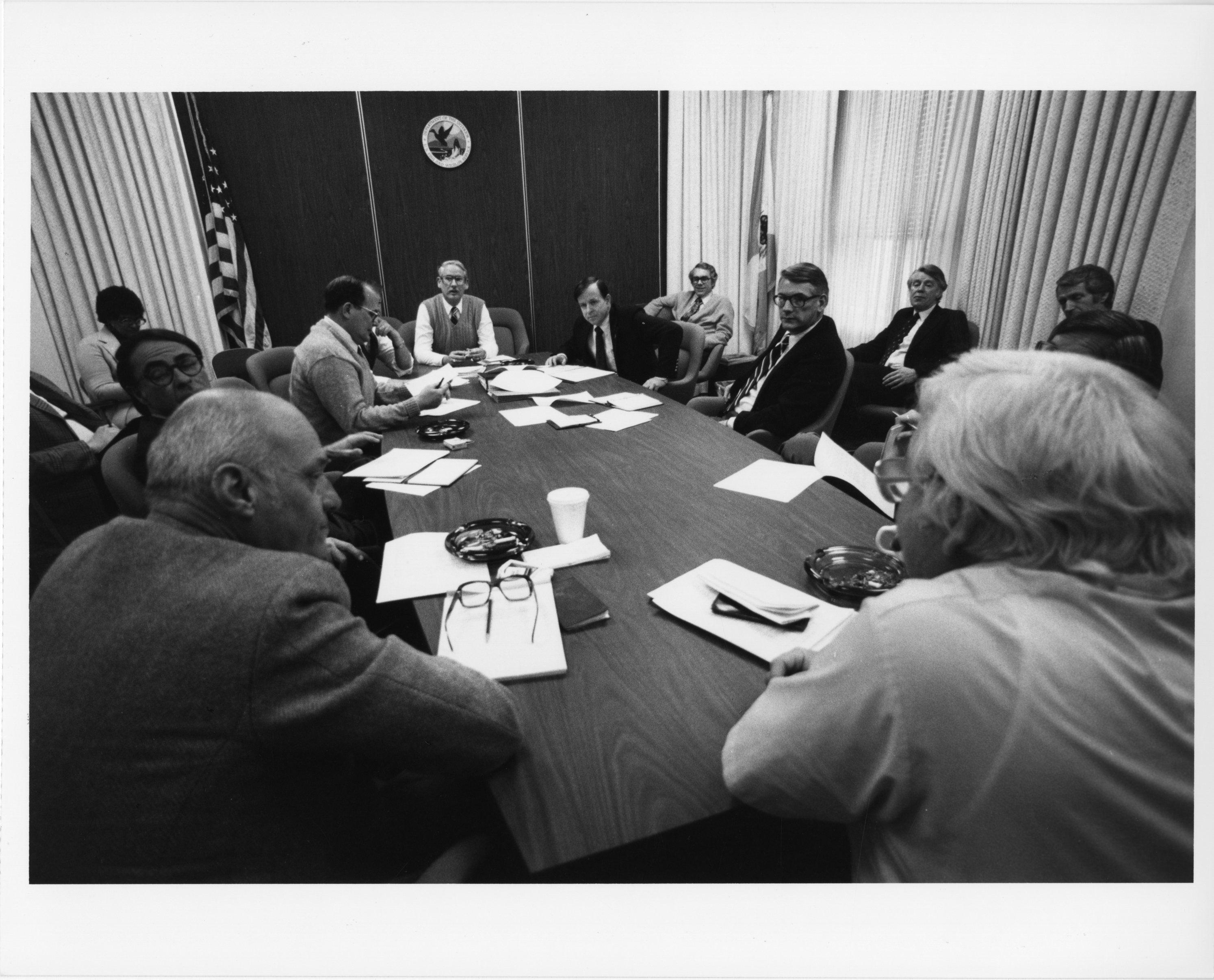 U.S. Fish and Wildlife Service Director Lynn A. Greenwalt (top center) leading a senior staff meeting at the Department of the Interior Building, Washington, D.C., March 1980.
