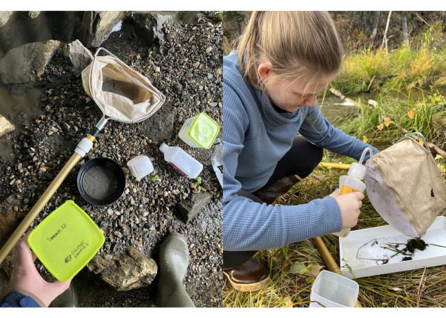 Left: Tools used to collect macroinvertebrates from Cripple Creek. Right: Maggie House squats on the banks of Cripple Creek as she identifies macroinvertebrates caught in her kick net. Photos courtesy of Maggie House.