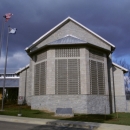 View of the front of the Main Entry building with flags flying on the National Conservation Training Center campus.