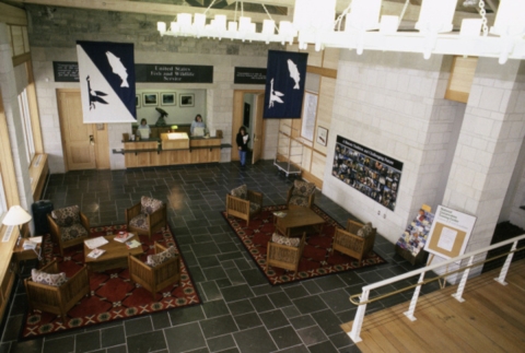 Main Entry building reception desk and lounge area at the National Conservation Training Center.